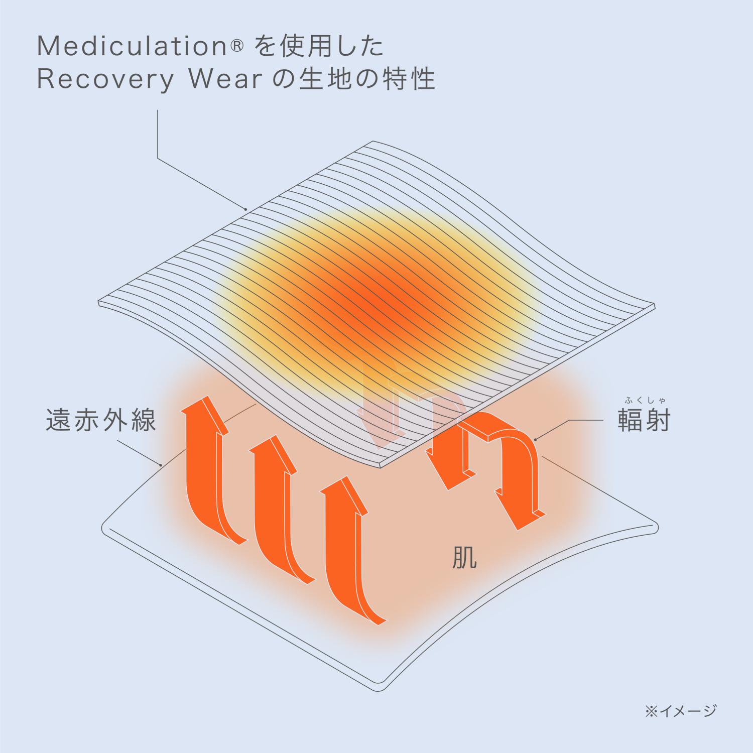 天然鉱石を原料とした高純度セラミック(非金属)を練り込んだ特殊繊維「Mediculation®」は、遠赤外線による輻射熱(ふくしゃねつ)の血行促進作用により、疲労回復ができる素材。