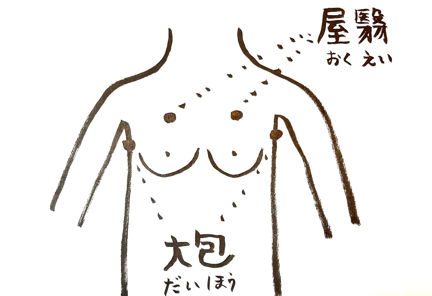 腕を組んで中指を脇の下の大包に、親指を屋翳に当てると