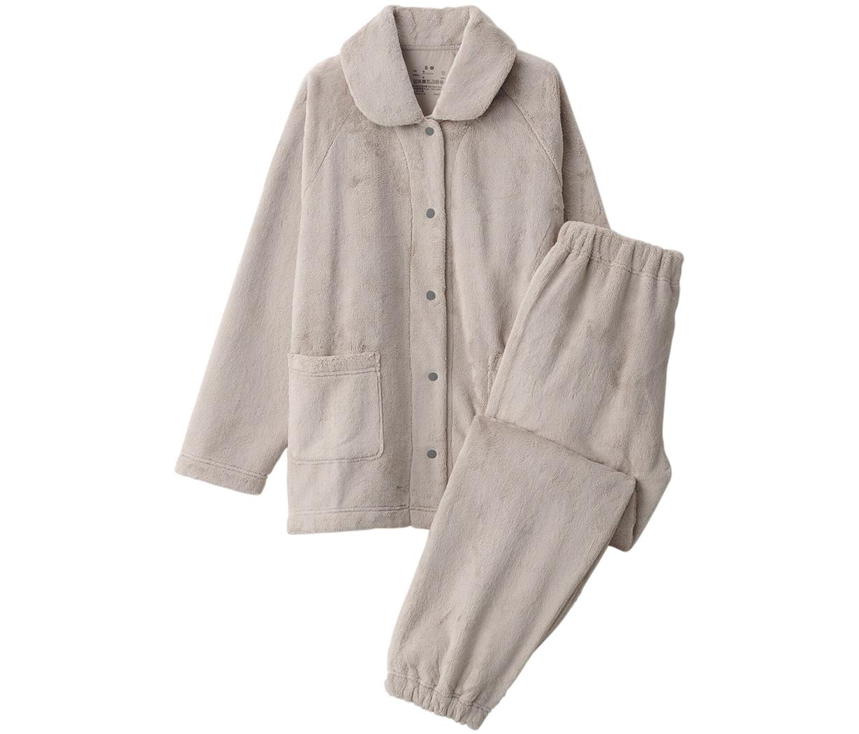 ユーカリを主原料とした再生繊維を使った毛布の生地で作られたパジャマ。あたたかくなめらかな肌触りが特徴で、寒い夜もふんわりとした生地が全身を優しく包んでくれます。トップスは丸衿で、首元までしっかりあたためられる仕様です。さっとはおれるので、ちょっとそこまでというときのアウターにも。ボトムの裾もゴム仕様にすることで、引きずるストレスをなくし、寒さが入り込まないよう工夫されています。帯電防止の糸を使用しているので、脱ぎ着の際もパチパチとしにくく、乾燥しやすい冬の肌でも、気持ちのよい着心地。カラーは、アイボリーとグレイッシュブラウンの2色展開(カラーによっては完売の場合があります)。