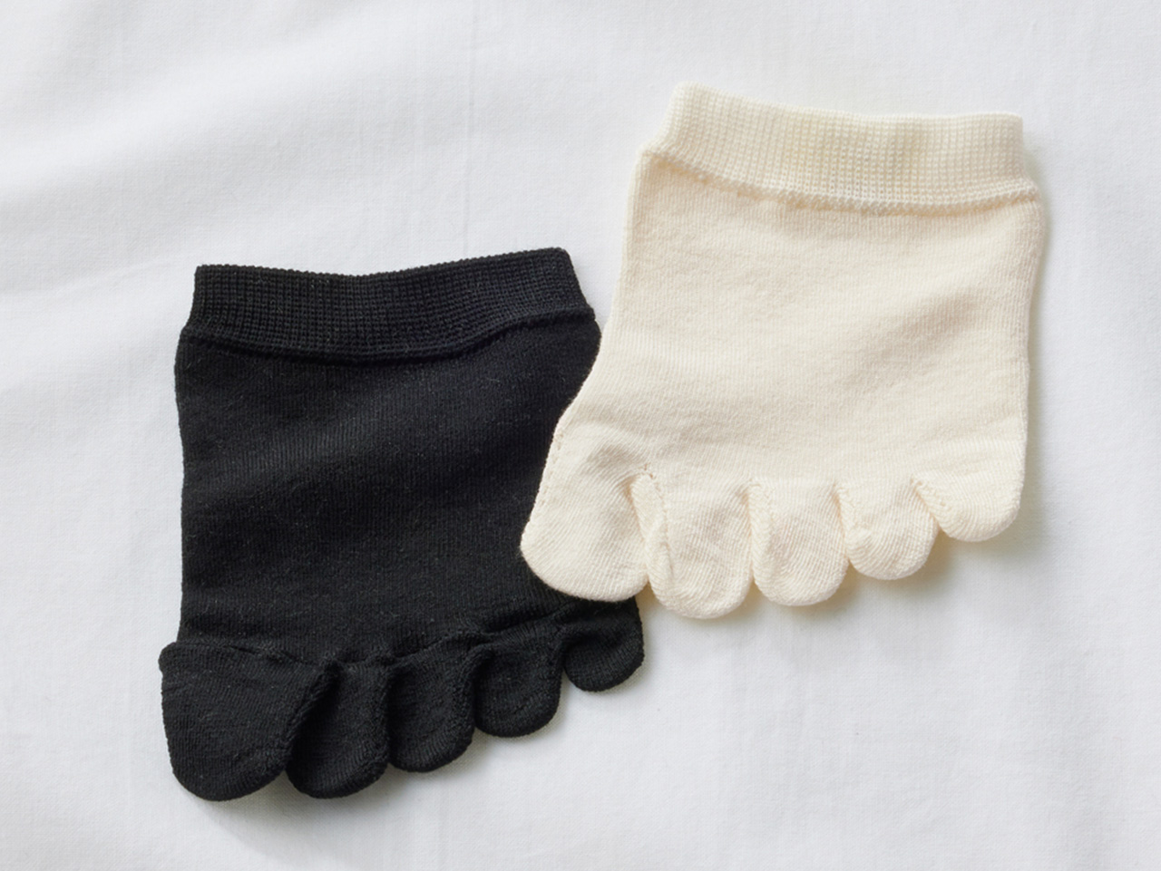 靴下やタイツのインナー履きに最適な5本指トゥカバー。冷え取り靴下としての活用もおすすめです(※靴下着用時の保温を目的として設計)。表糸はシルク100%、裏糸にはシルクのストレッチ糸を使用しており、肌触りが優しいことも特徴です。吸放湿性に優れているので、秋冬はあたたかく、春夏は涼しく、365日快適に着用できます。カラーは、ブラックとオフホワイトの2色展開。