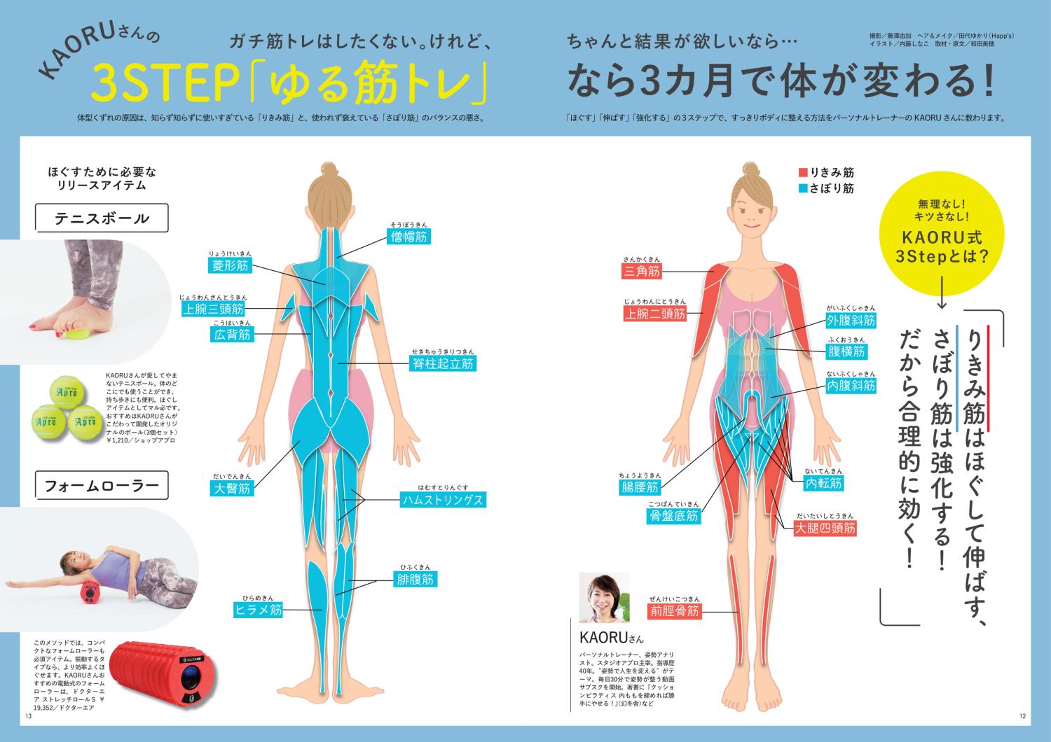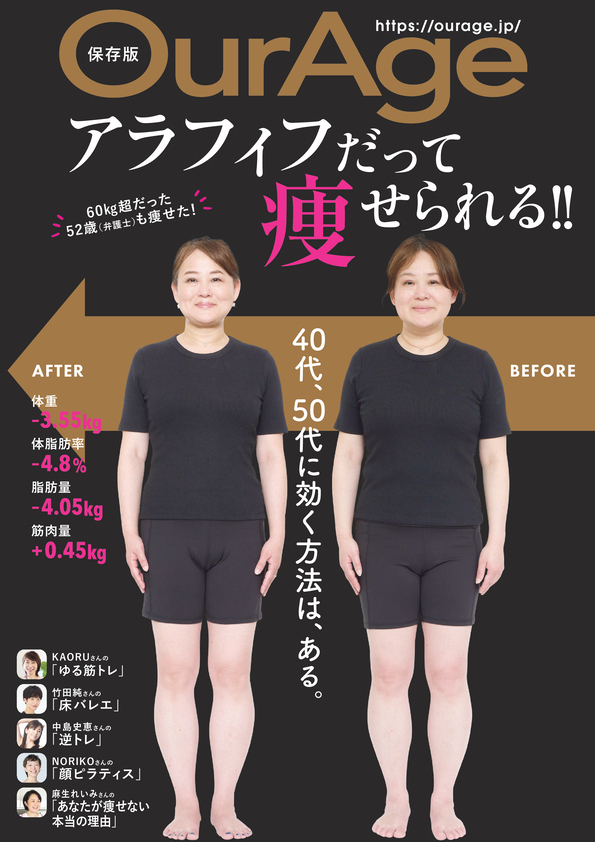 小川さんを指導したKAORUさんの「ゆる筋トレ」のHOW TOと、食事指導をした麻生れいみさんが語る「痩せる食生活のコツ」は『アラフィフだって痩せられる!!』にたっぷり掲載しています。