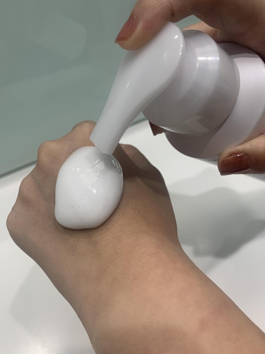 Mさんも泡をのばしながら「おおー♪」と驚きの声。まずは密度の濃い泡が肌に気持ちいい~。花王といえば「炭酸泡」、血流アップ効果でむくみやくすみをとばしてくれると、すでに多くの女性の新たな定番アイテムになっています。