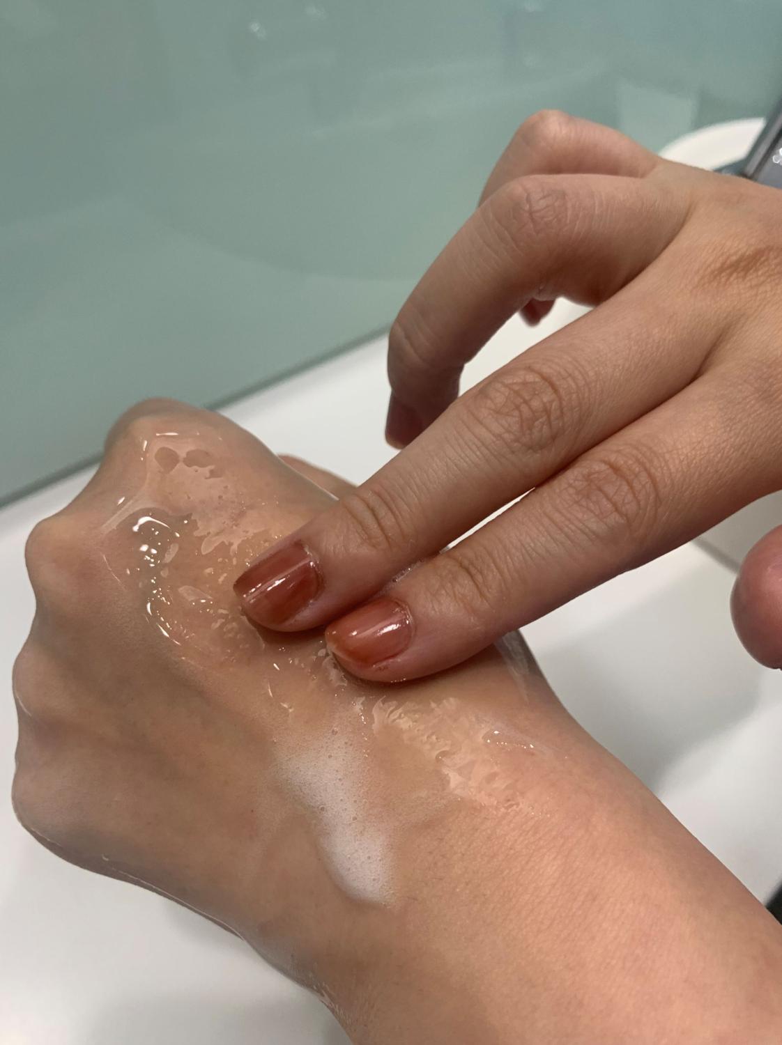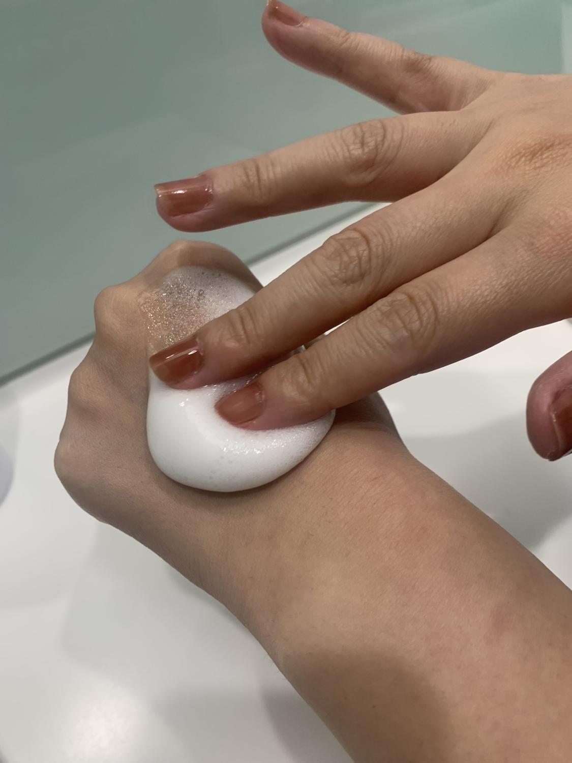 さらに泡をなじませた後のジェルが、肌にとても優しい感じで、いいんです!肌を摩擦することなく保護しながら、表面の汚れをオフしてくれそう。しっかりなじませて洗い流した後のMさんの手は、数段トーンアップしてしっとり♪ 日頃から敏感肌に悩み、キュレルの化粧水を愛用している、というMさん、さっそくこの洗顔料をチェック!