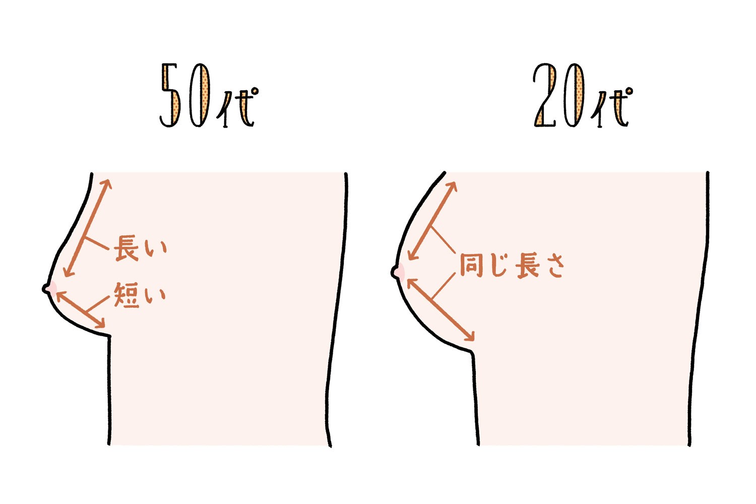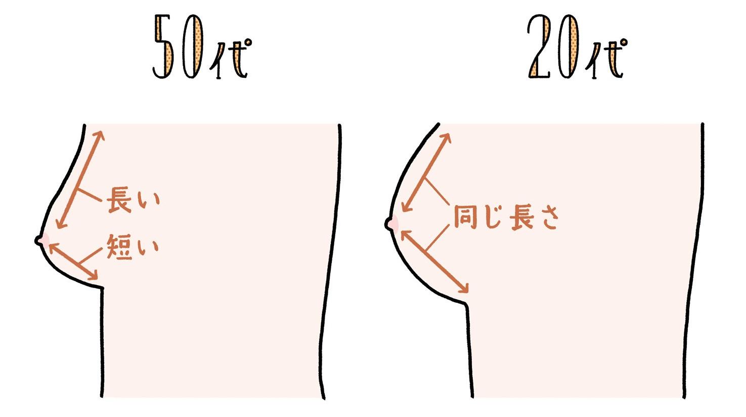 「前回もお話ししましたが、バストは底辺の円周、バージスラインと呼ばれる場所から年齢とともに脂肪がついてくずれやすくなります。また、バストの形を横から見ると、バストトップを中心にして上下の長さが同じくらいだった20代前半頃に比べると、50代のバストトップの位置は下がります。そのためバストの上の距離は長く、下の距離は上の距離と比べると短くなっていきます」(湯浅さん)