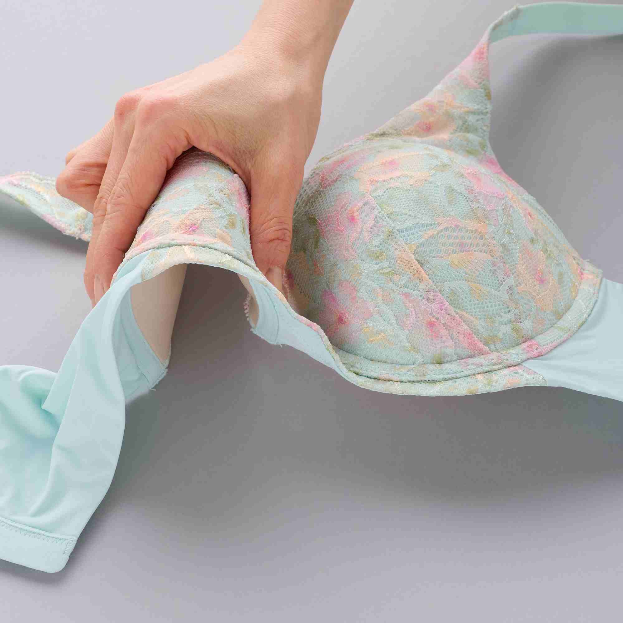 「ブラジャーの底辺をつかむと、こんなにしなやかにワイヤーがしなります。ワイヤーの大切な役割のひとつは、体の動きに合わせて3次元に角度や開閉幅を変えながらバストを支えてくれること。柔軟なワイヤーなら痛みや違和感を覚えずにバストの形を美しく保ってくれます。
