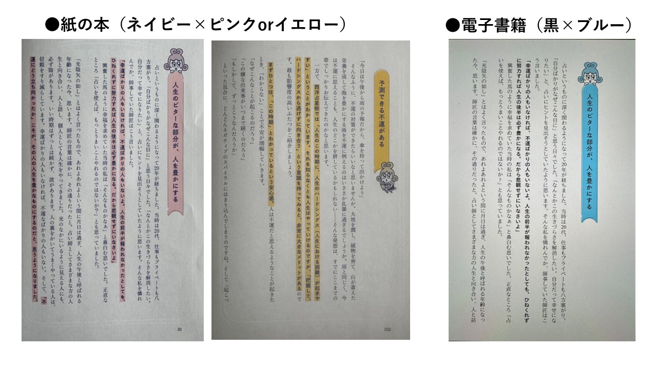 紙の本は3月5日発売にふさわしい春色の2色刷りで、ネイビーにピンク、もしくはイエローの2パターン。基本はネイビー×ピンクで、占いのパートだけ、わかりやすくネイビー×イエローにしてみました。電子版は、ビジネスマンで読んでくださる方も多いかな、とブラックにブルー。スマホやタブレットなどでもすっきり読みやすくなっています。お好みに合わせてお選びくださいね。もちろん両方入手いただければ、よりこの本のよさを日々感じて活用していただけるかと。