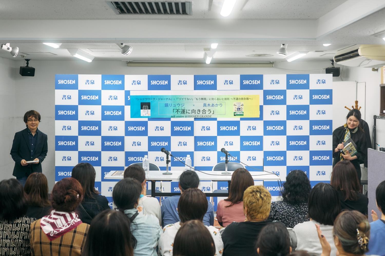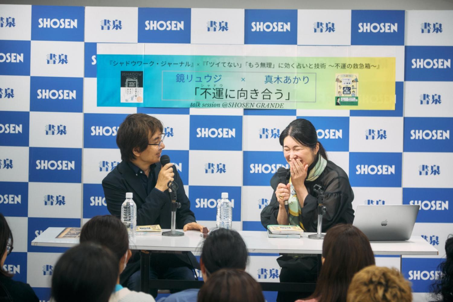 新刊『「ツイてない」「もう無理」に効く占いと技術 ~不運の救急箱~』(集英社、以降は“不運本”)が話題の占い師真木あかりさん。1月に『シャドウワーク・ジャーナル ”本当のあなた”になるためのガイド』(すばる舎)を出版した鏡リュウジさん(鏡さんは翻訳を担当)と、神保町の書泉グランデで対談イベントを開催しました。テーマは「不運(シャドウ)に向き合う」。