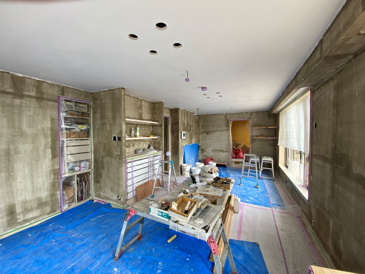 家の中は、住んでいるときとは様相が一変。どこもかしこも養生シートで覆われ、あちこちのドアが開閉困難な状態に。聞いていたとおり埃っぽく、資材や作業道具があふれ、移動にも注意が必要です。日によっては電動ドリルの音がうるさい場合も。またガスレンジや換気扇、トイレの交換などにより、それらが使えない日も。どう考えても日常生活を送れそうにありませんでした。もし私たちががずっと部屋にいたり毎日帰ってきたら、作業をする職人さんたちにも、かなり気を使わせてしまったことと思います。