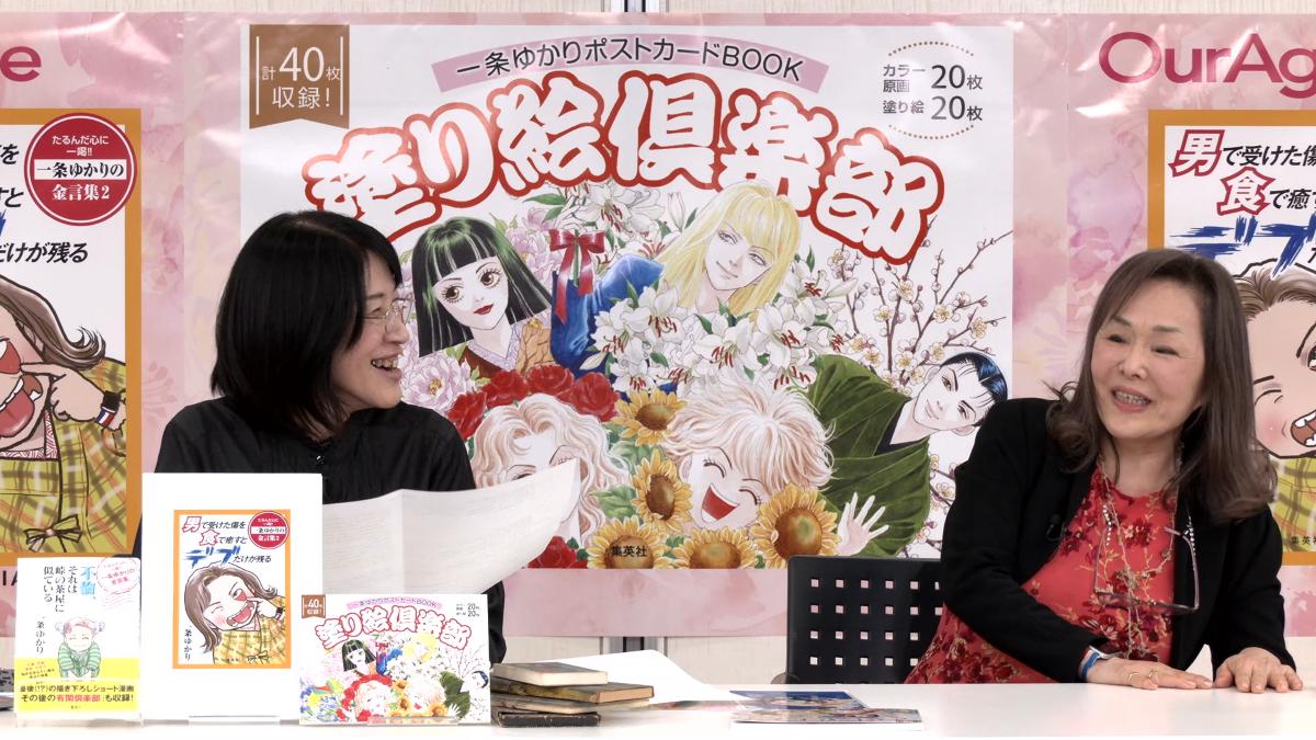 先生自らが選んだ美麗なカラー原画20枚と、それを丁寧に再現した塗り絵20枚、計40枚のポストカードがセットになった『一条ゆかりポストカードBOOK 塗り絵倶楽部』と、OurAgeで連載中のエッセイを電子書籍化した『男で受けた傷を食で癒すとデブだけが残る たるんだ心に喝! 一条ゆかりの金言集2』を2冊同時に発売しました。