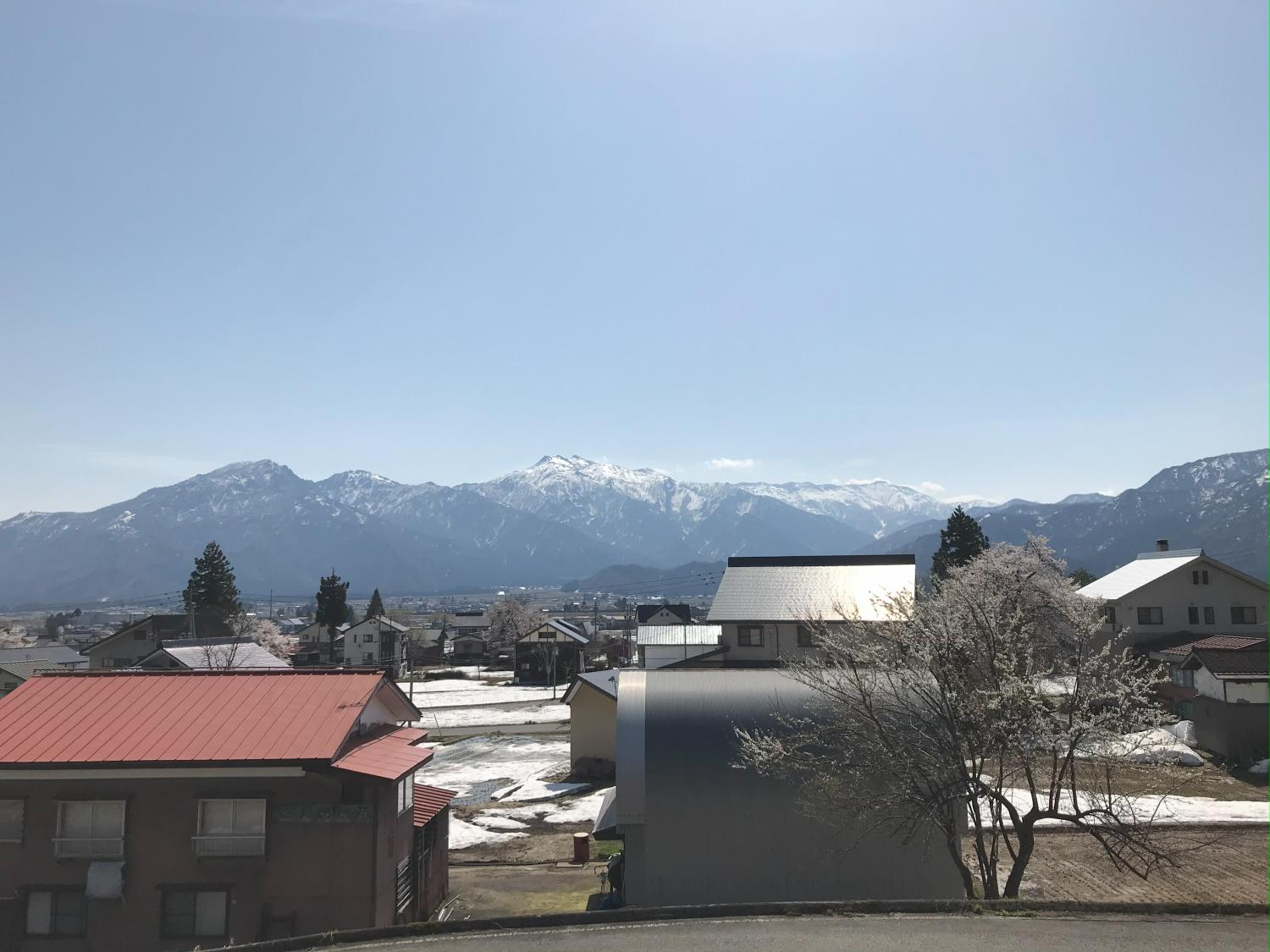 ↑R大沢駅から広がる新潟の風景。当時は4月だったのに、山の上にはまだ雪が…