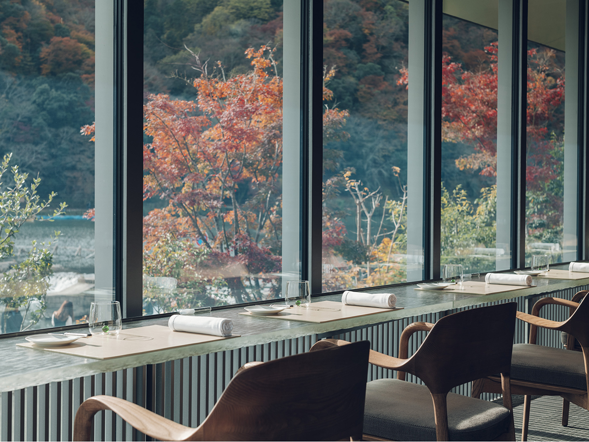 桂川・渡月橋を望むカジュアルレストランMUNI LA TERRASSEと、ロビーの庭園「白の庭」は人気のスペース。ディナーはメインダイニングのMUNI ALAIN DUCASSEで。京都の食材で仕立てるフランス料理が美味。