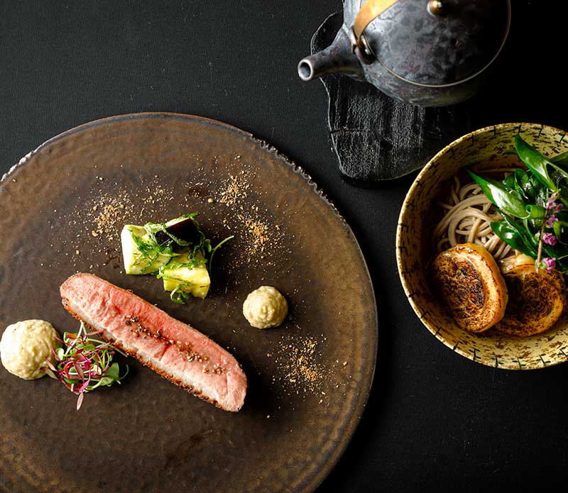 夕朝食付きのプランは、夕食に薪火で仕上げるコース料理をいただける。