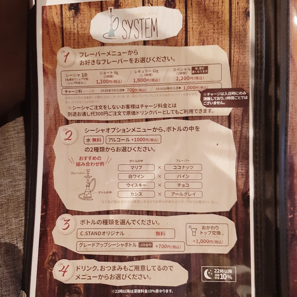 気になる料金は、シーシャ料金+チャージ料金+オプション料金+ドリンク代です。