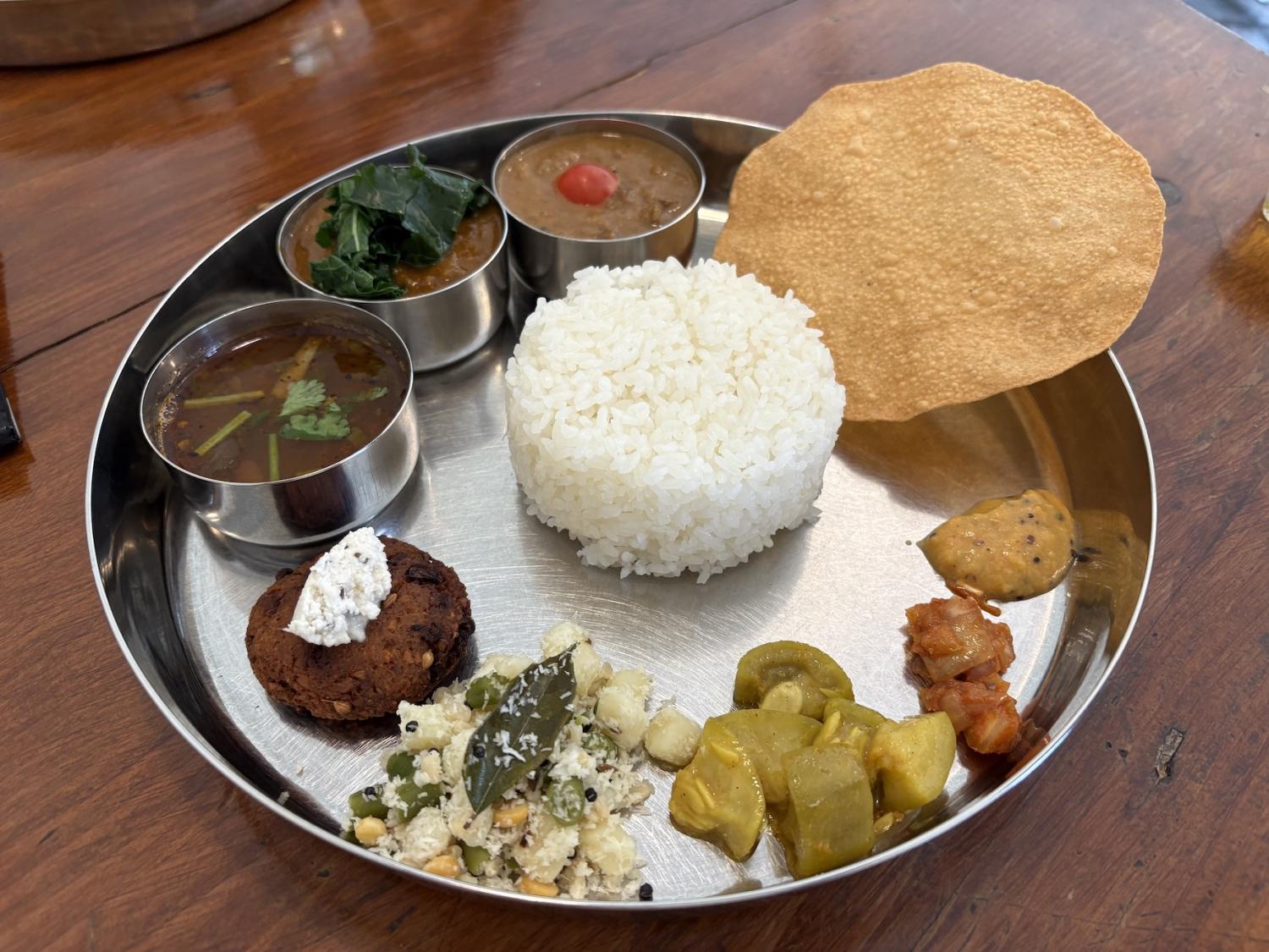 2種類の野菜カレー、ワダ(豆と野菜のコロッケ)、パパド(豆のチップス)、野菜の炒め煮、ピクルスなど。