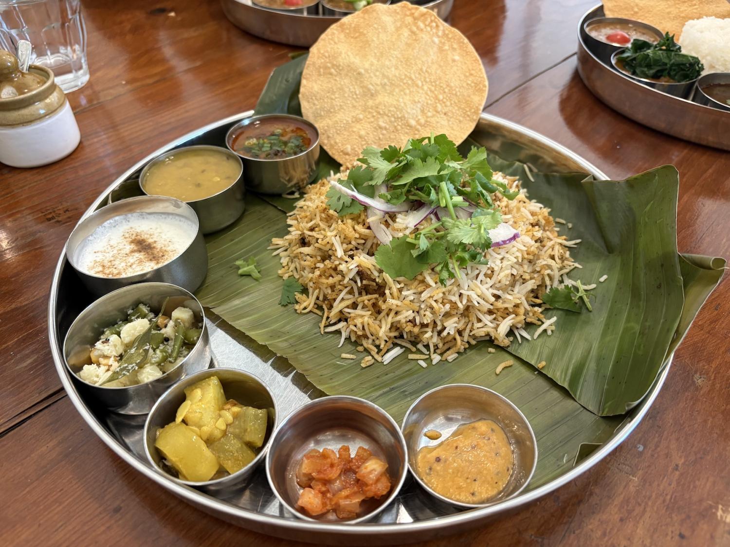 バナナの葉で蒸したスパイスご飯とお惣菜。カレーも選べて私は「フィッシュカレー」をチョイス。魚の凝縮した旨味とマスタードオイルの香りがご飯によく合う!