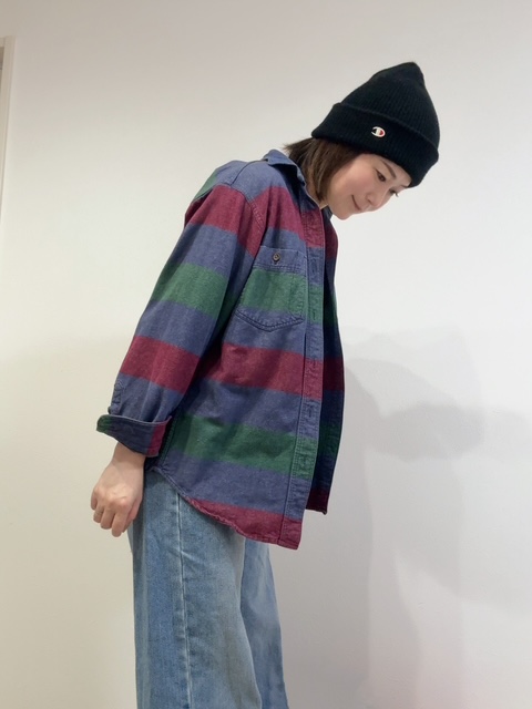 チェックや無地ではなくてボーダーのデザインと色味が気に入って購入しました。分からないなりに調べるとタグ表記は多分80か90年代のもの、サイズがメンズのSサイズだったからかお安めでした。東京とかの古着屋さんで買ったらもう少しお高いんだろうなーと自分に言い聞かせながら・・・。
