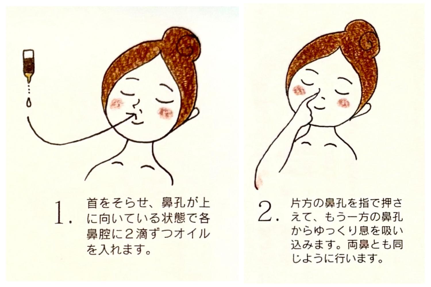 スポイトが手元にない、面倒、という方は、ただ鼻の内側にオイルを塗るだけでも効果はありますのでやってみてください。