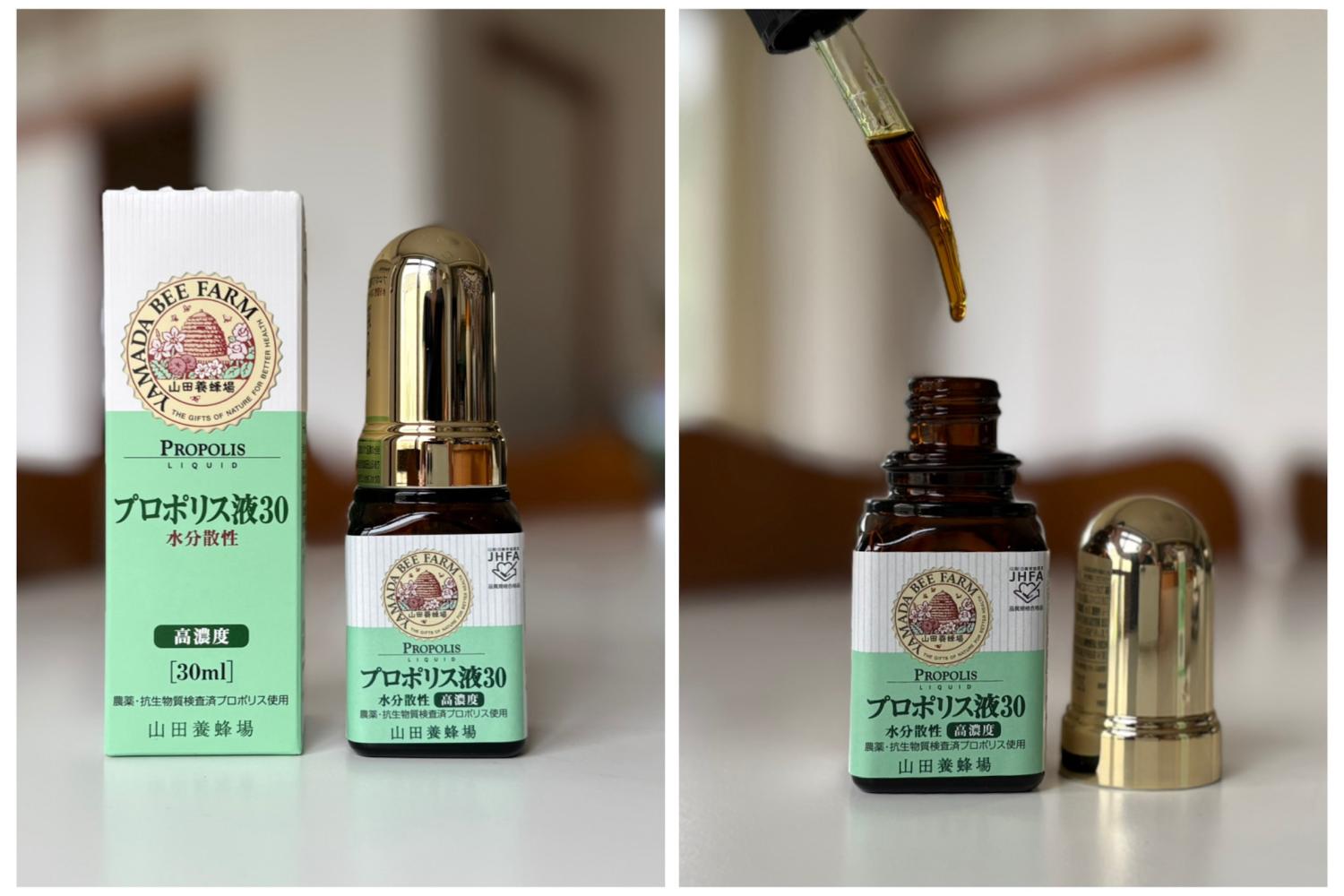 プロポリス液は山田養蜂場の高含有プロポリス液(30%)を愛用。独特の強い香りで刺激も強めですが、これが効果絶大。