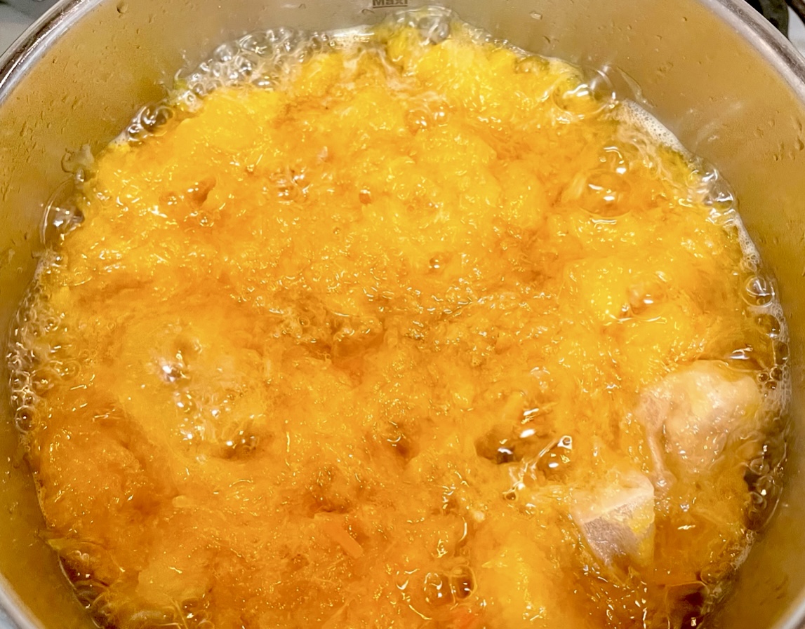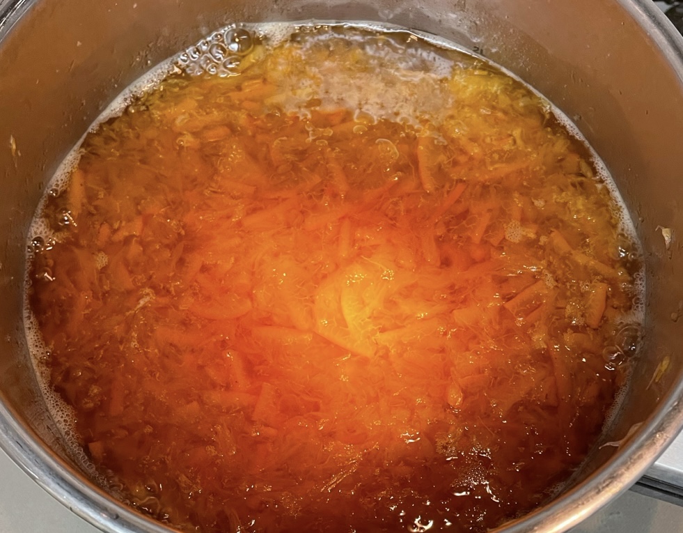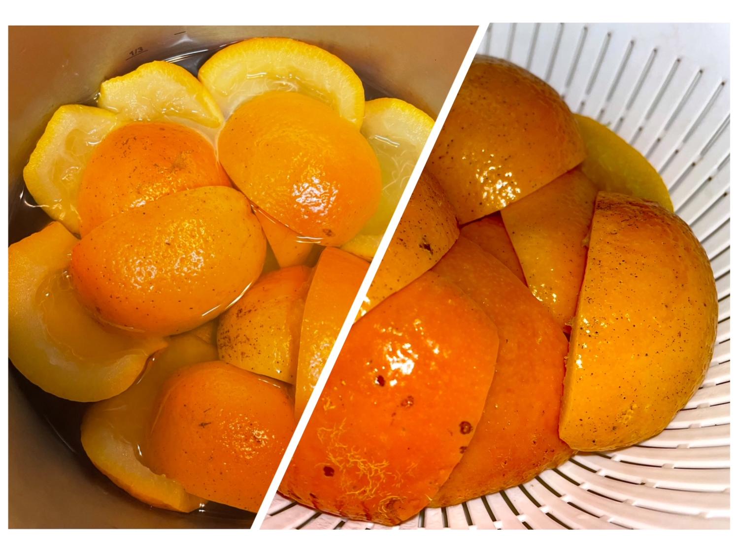 ⑤水が入った鍋に皮を入れて沸騰させ、5分ほど煮てザルにあげる。これを3回くり返す。