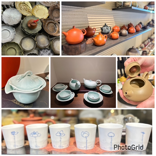 今回は美しい茶壺や茶器を探しに。ひとつひとつ異なる花の開花が描かれている蓮の茶杯は6個セット。