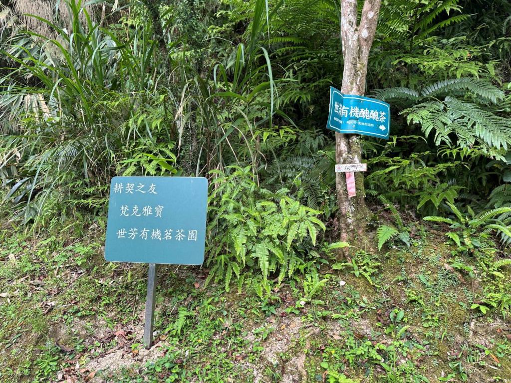20年以上一切の農薬を使っていない有機栽培の茶畑の入口には「世芳有機醜醜茶」という看板が。見た目は悪いが安心安全の有機農法で茶葉を作っているという証。一芯ニ葉で若芽だけを摘むのは、思った以上に時間がかかる作業。