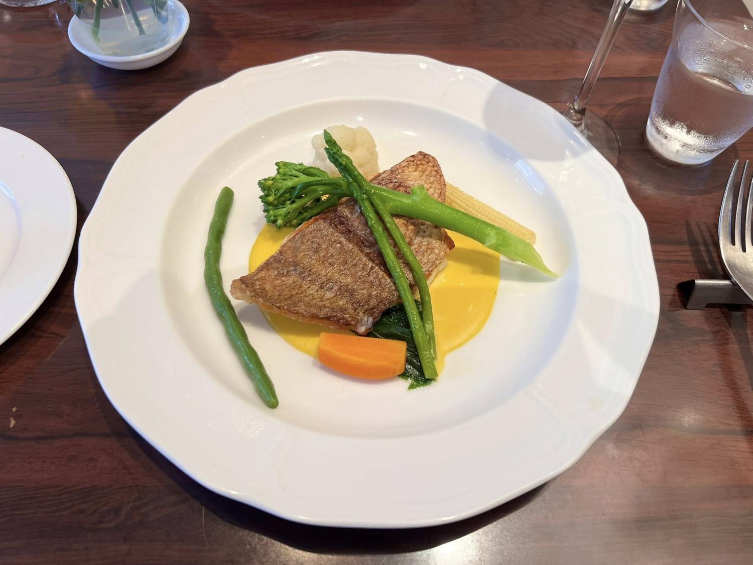 しっとりした白身にパリパリとした皮目の焼き加減が美味しい、シンプルに塩味とバターソースで素材が楽しめる一品。