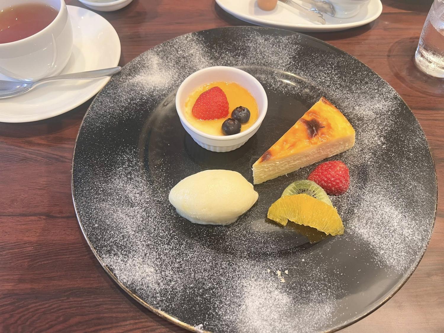パイナップルのシャーベット、ニューヨークチーズケーキ、プリン、フルーツ。美味しい盛り合わせ♡