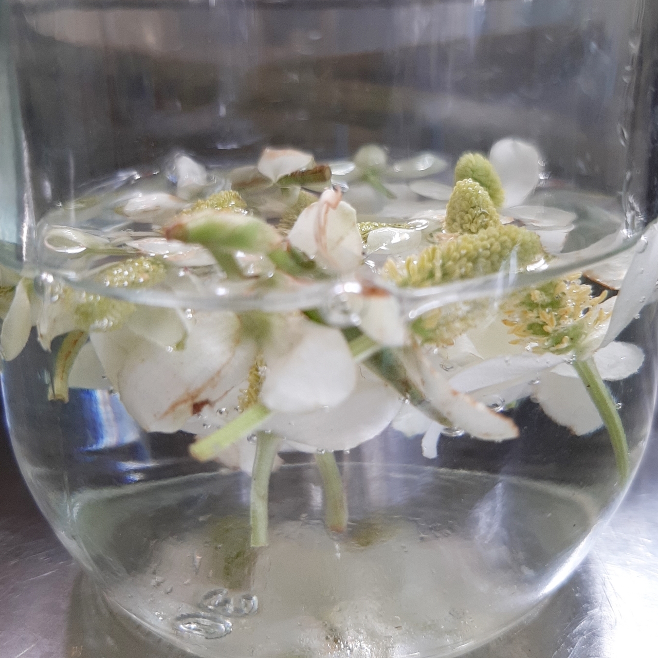 煮沸した瓶に摘んだドクダミのお花を入れて焼酎を注ぎます。