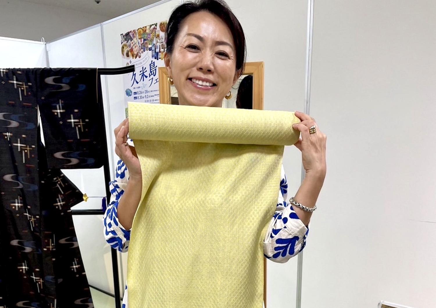 久米島の特産品が勢揃いするということで、友人たちとの再会も楽しみに訪れた“久米島フェア”で思わず衝動買いしてしまったのが、かねてから憧れていた久米島紬(くめじまつむぎ)。美しい紬欲しさに「海外行くし、日本文化大事だし、着物がないと始まらないし」と夫にアピールして高価な着物を仕立ててもらった手前、飾っておくわけにもいかなくなり。