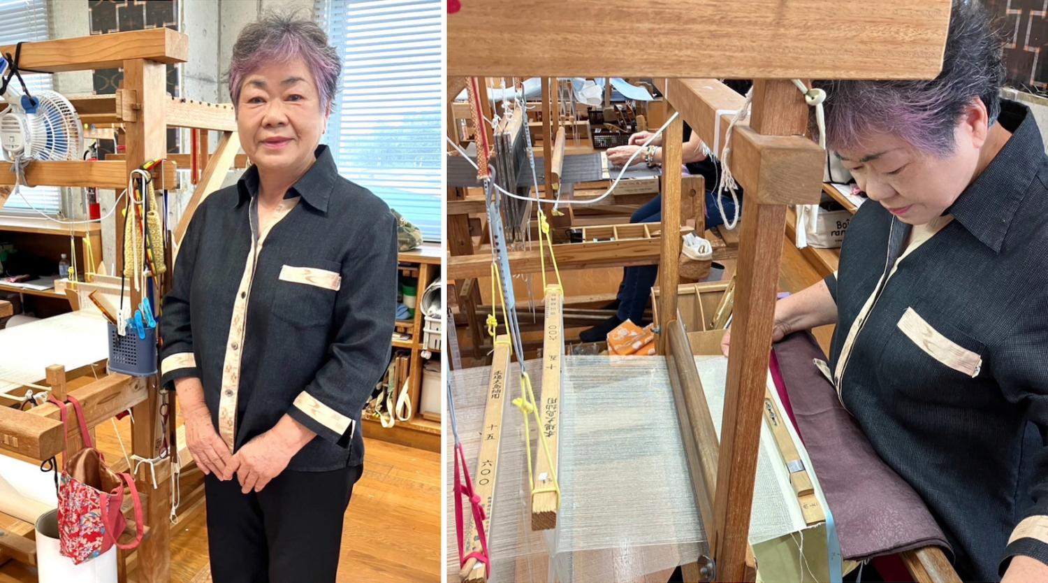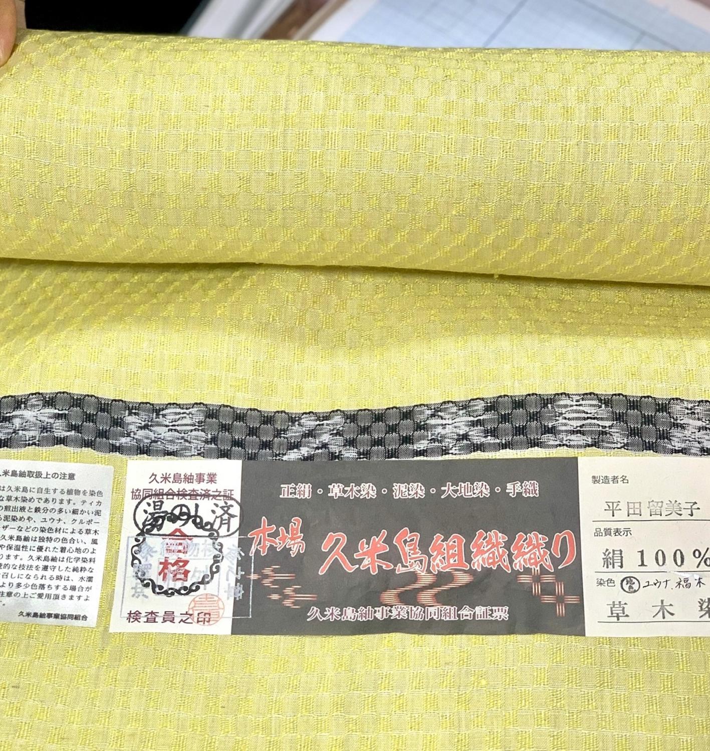今回一目惚れした紬は、“ユウナ” と “福木” という植物で染めた糸で織られた作品。一見無地に見えますが、縦糸と横糸の交差具合によって凹凸をつくりニュアンスを出す組織織りという技術で織られていて、福木の鮮やかな黄色をユウナのグレーが抑えてほどよく大人っぽい色合い。