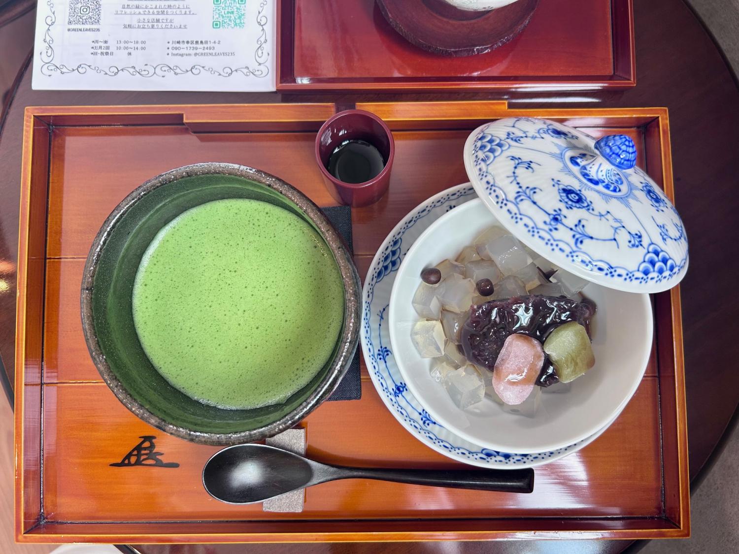 どれも魅力的ですが和菓子と飲み物のセット、あんみつ豆をオーダーしました。飲み物はもちろん大好きなお抹茶を。