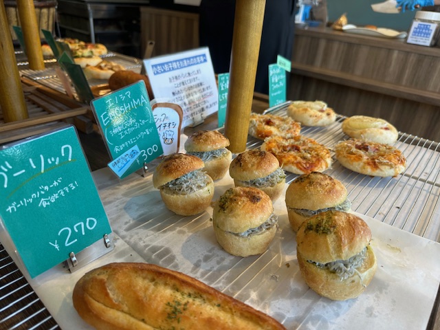腰越駅を降りてすぐ目の前にあるパン屋「ル・ボートン」へ立ち寄り、まずはこちらでお買い物。しらす&エスカルゴバターのパンなどを買い、目指すはNEW OPENのレストランへ。