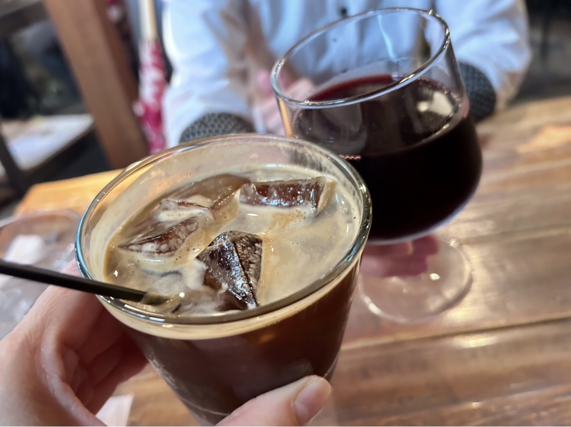 この後に仕事のため、私はアイスコーヒーで、まずは乾杯です。