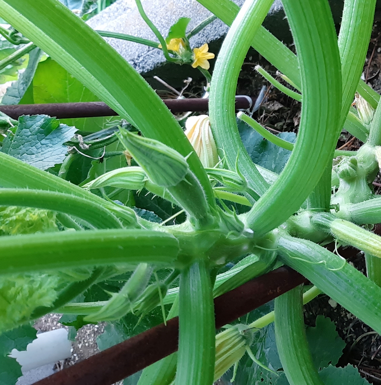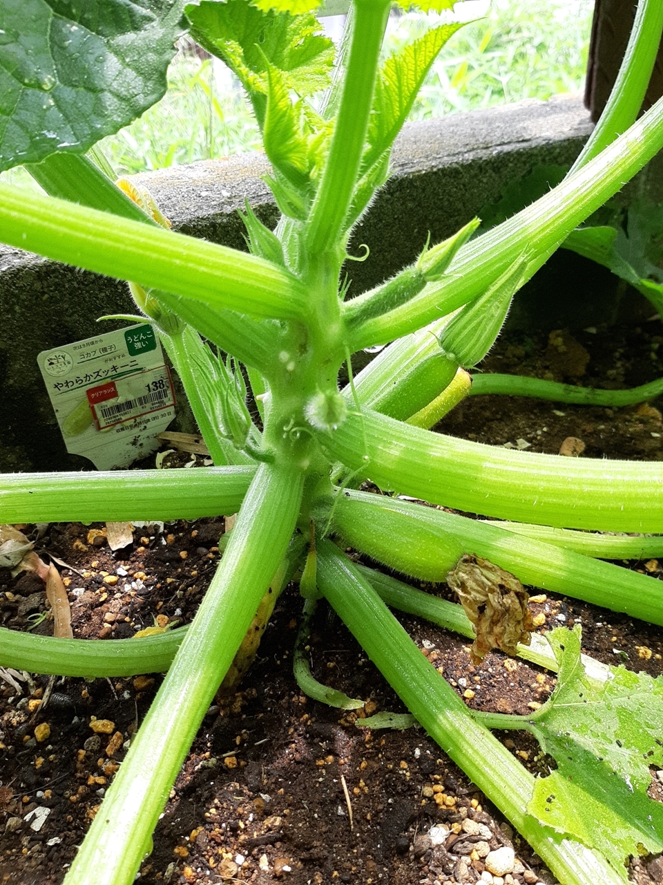 初めて育てたズッキーニですが、成長していくと主軸脇に突き刺さるようにズッキーニが生えてきてびっくり!