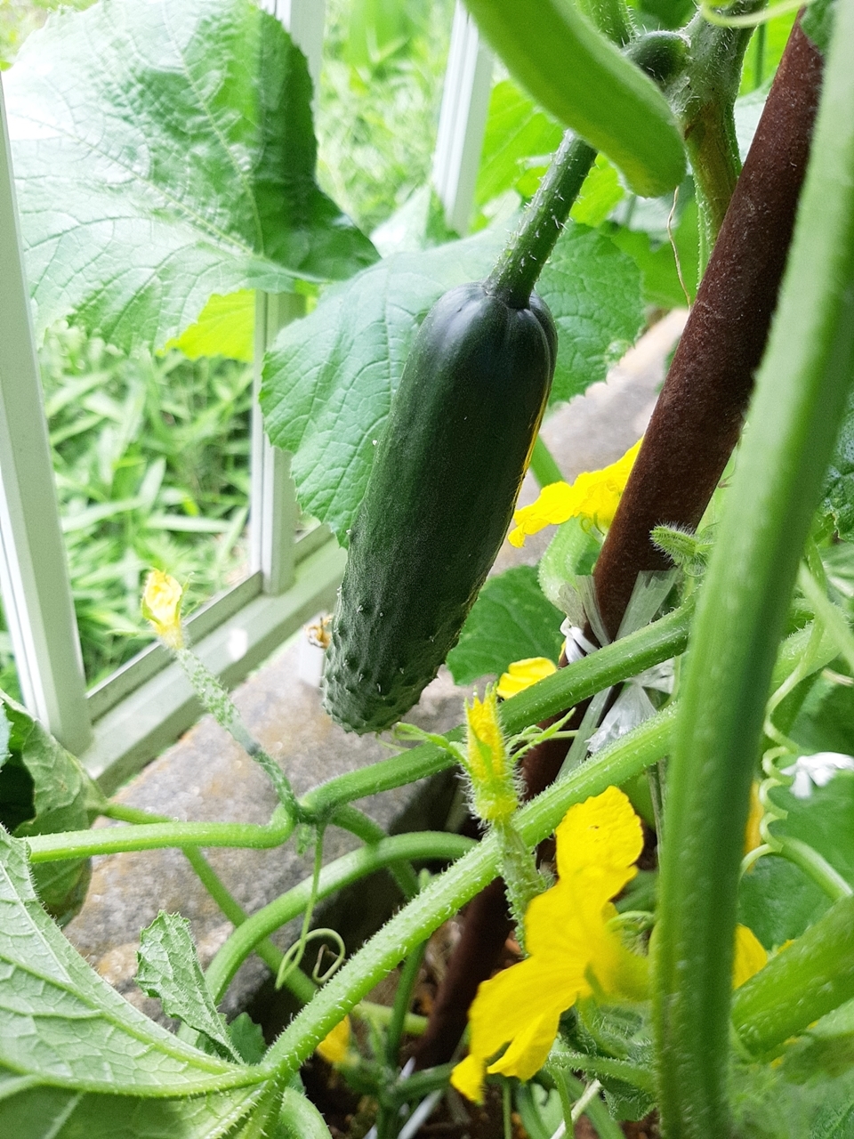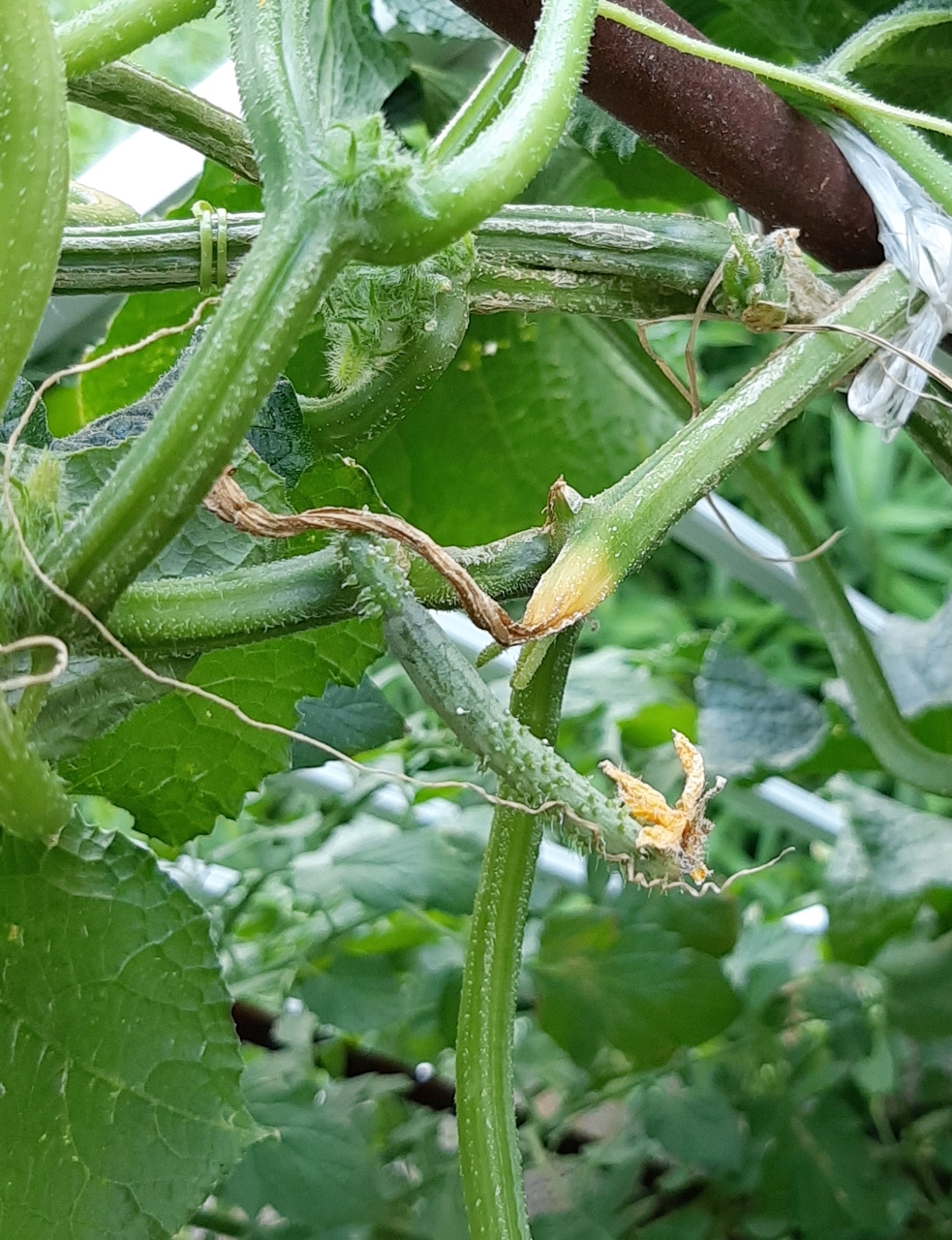 収穫直前のきゅうりの上に2本ちびっこきゅうりがあるのが見えますか?