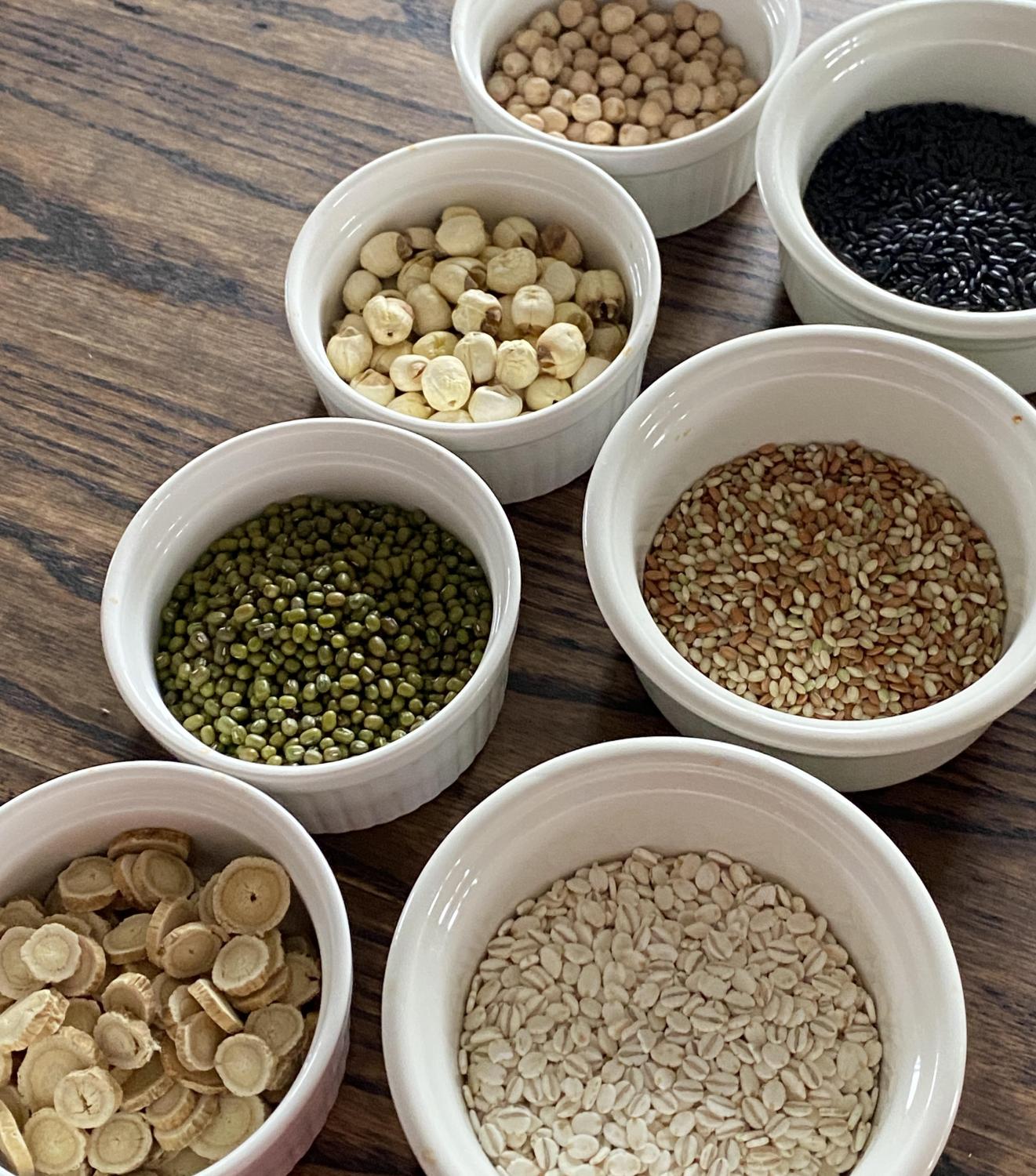 写真にずらりと並ぶのは、日々のごはんに登場する薬膳食材たち。薬膳と聞くと、体に良さそうだけど特別な材料や難しい手順を想像し、ちょっと無理かな…と思われる方も多いかもしれません。そのような方は雑穀ごはんから薬膳を始めると良いですよ!