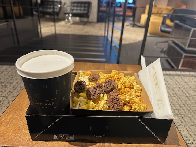 私達が今回利用したSクラスは、座席のピッチがより広いお席で、電動リクライニングつき、充電設備のあるサイドテーブルもあり、隣席の人の気配もわからないほどの独立感はさながらファーストクラス!?のようでした。映画に心置きなく没入できる自分だけのスペシャルな空間は素晴らしかったです。