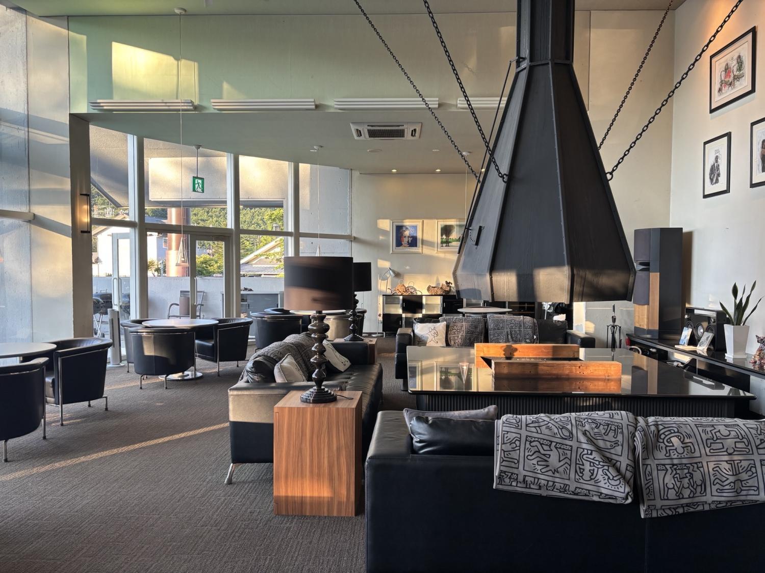 解放感に包まれたロビーには暖炉があり、壁に描かれたアートもおしゃれでした。