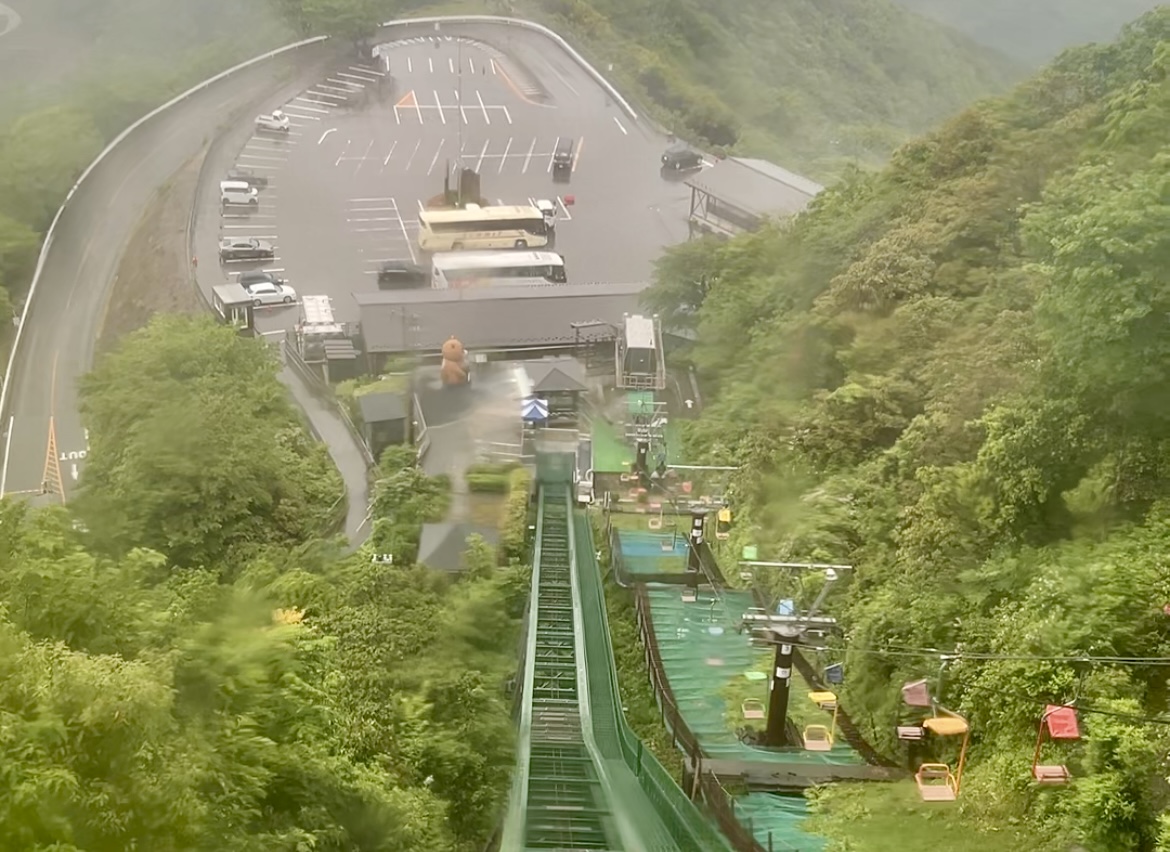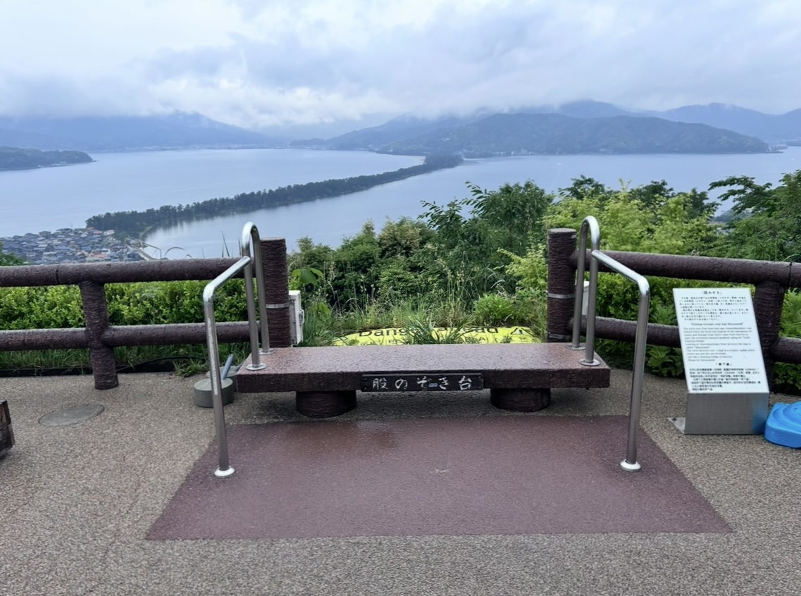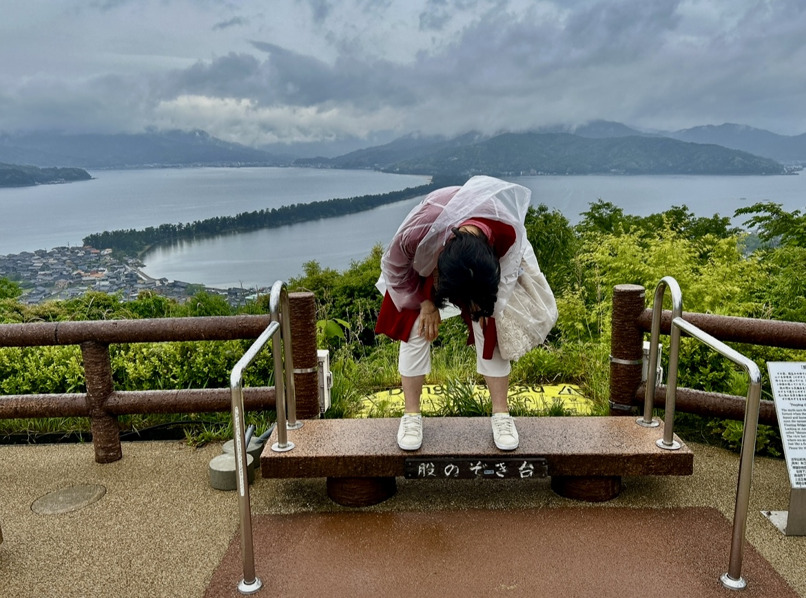 メインの天橋立の日はあいにくの雨でしたが、レインコートをお借りして、リフトで《股のぞき》発祥の地、傘松公園に上がって行きました。標高130メートル。