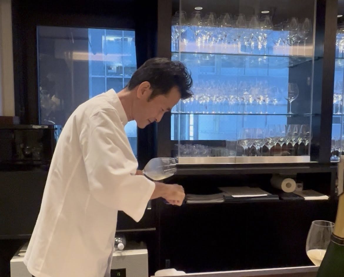 ソムリエでもあるシェフの吉田氏は、ワイン温度とタイミングにとてもこだわりがあり、グラスにワインを注ぎ最適な状態にしてから提供しくれます。さらに、出されたワイングラスは決してクルクル回さず口に運ぶようアナウンスがあります。