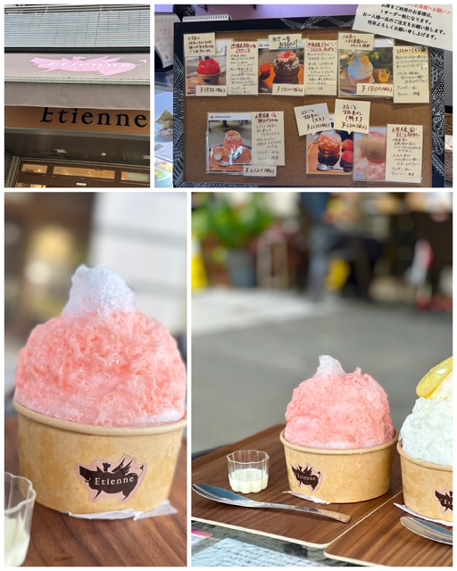 そのあとは、夏季限定のかき氷をいただきに「エチエンヌ」へ。屋外席で桃が丸ごと入った贅沢なかき氷をいただきました。