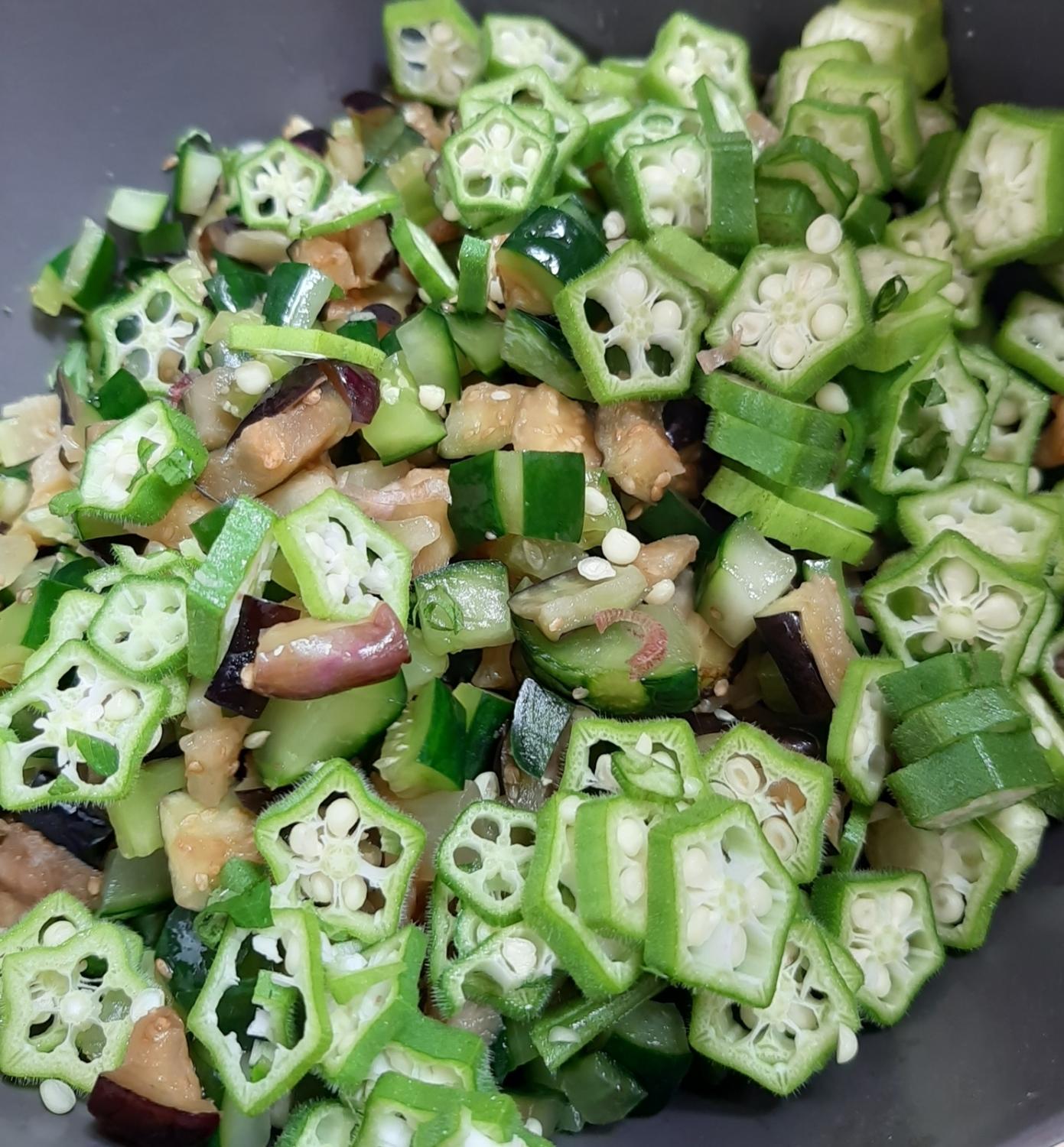 水分を絞ったなす・きゅうりに、小口切りしたみょうが・オクラ・千切りの大葉を入れます。