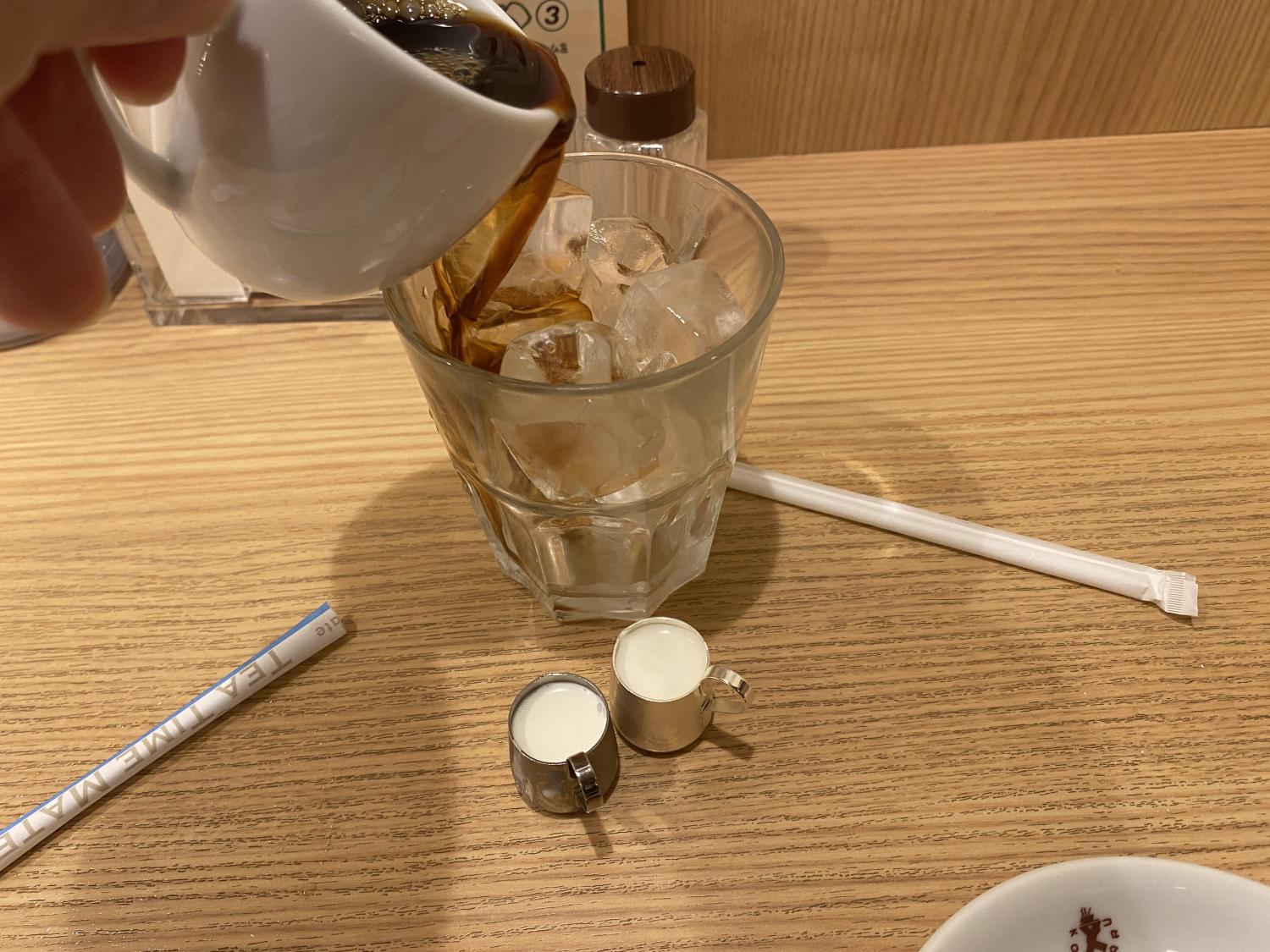 そして衝撃的だったのがアイスコーヒー。熱々のホットコーヒーを氷の入ったグラスに一気に注ぎ込むというスタイルで、びっくり!キリッと冷えてコクが残る味わいはクセになりそうです。