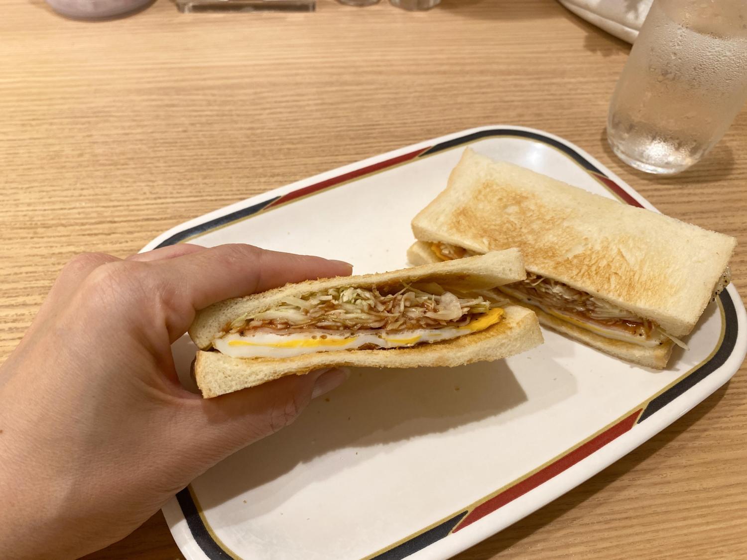 お待ちかねのハムエッグトーストは、厚みのある卵とハム、シャキシャキのキャベツがサンドされていて食べごたえ十分。朝からしっかり元気をもらえるセットでした。