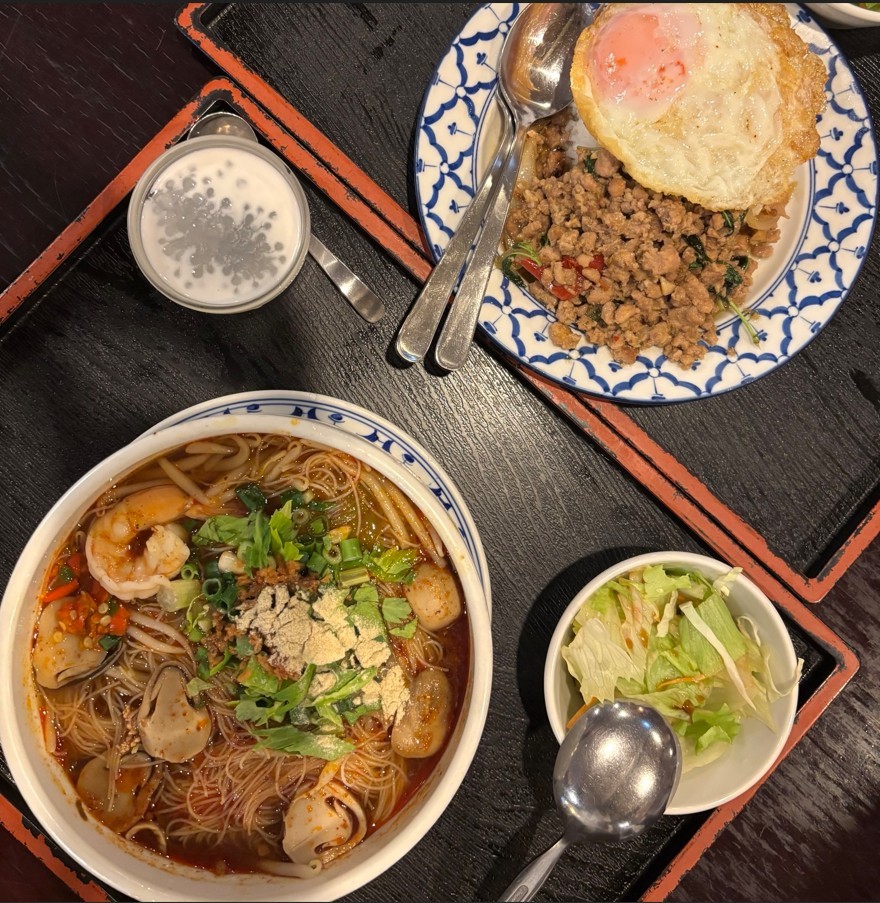 選んだランチは『センミートムヤムクン(ビーフンが入ったトムヤムクン)』と『ガパオライス』。サラダもデザートも当時のままです。
