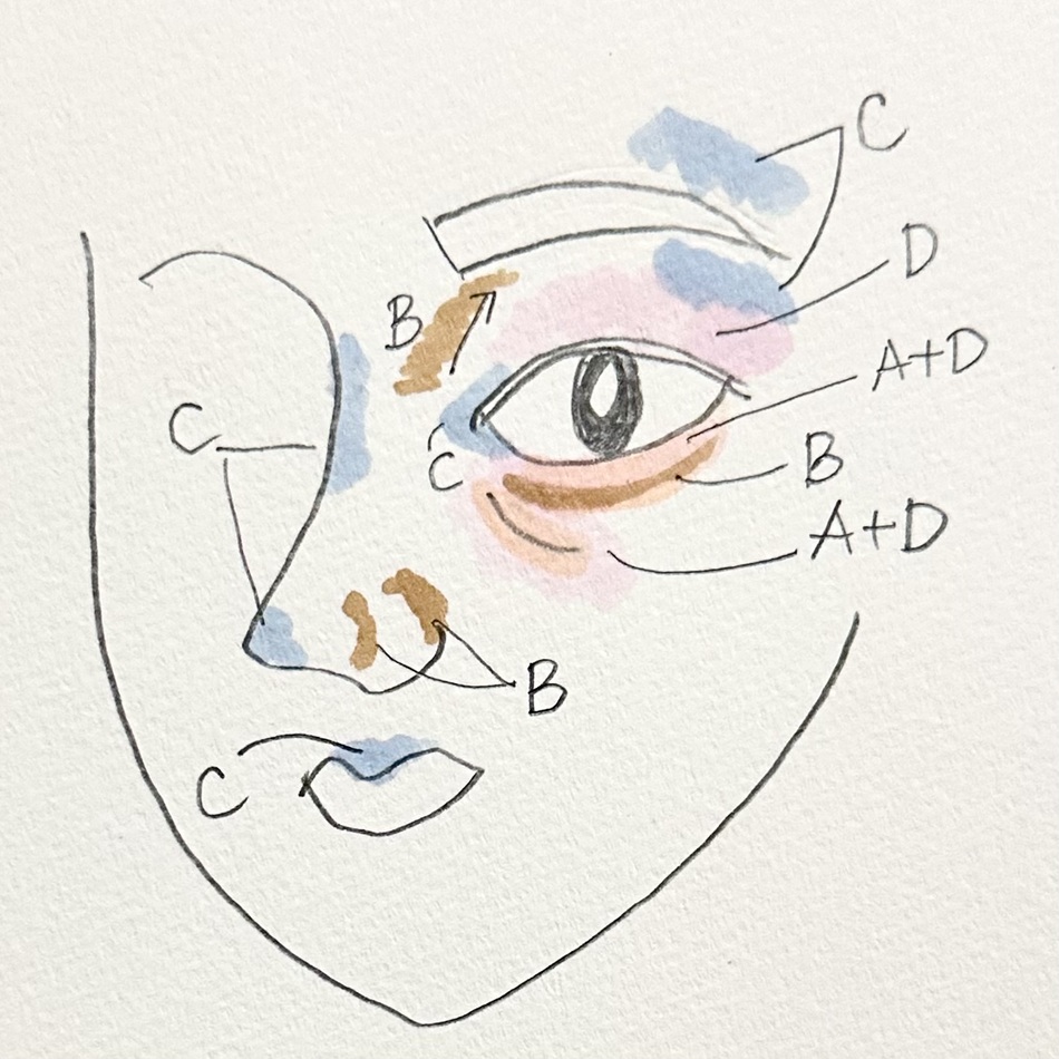 1. 目の下の涙袋部分に、A)ペンシルライナーのコンシーラーを塗って、D)シャドウパレットのアプリコットを重ねます。涙袋の影のラインには、B)ペンシルライナーのシェーディングカラーを。