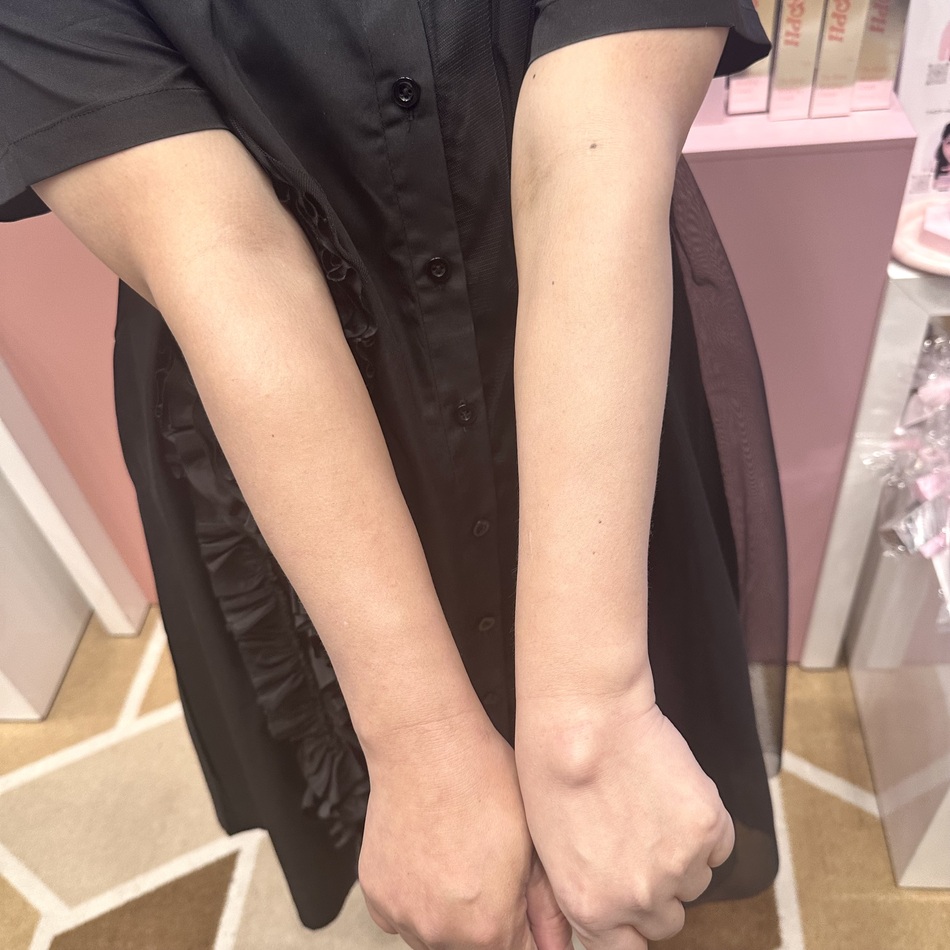 写真の向かって右側の腕にトーンアップクリームを塗っています