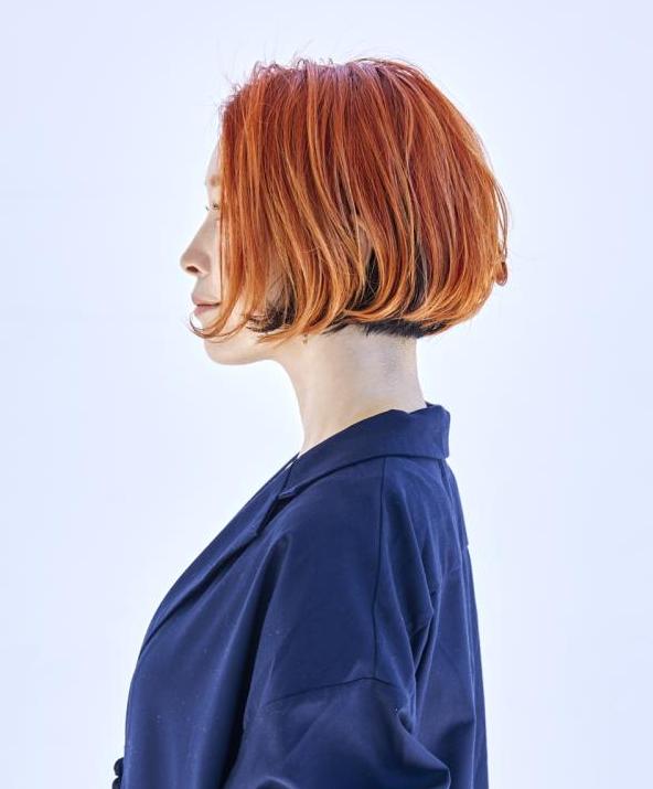 表面だけが明るく、内側はダークブラウンになったバイカラーのアンブレラカラーだから、メリハリと立体感が生まれて、ボブにユニークな表情を生み出します。