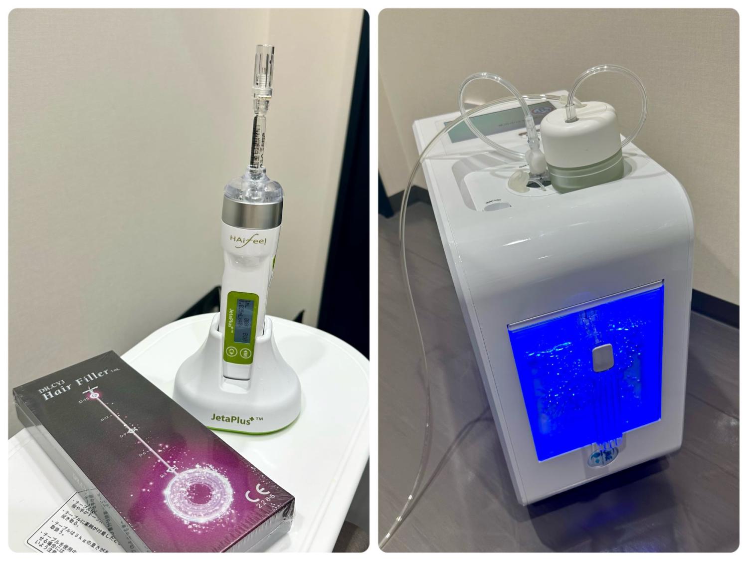 画像左が毛髪再生用注入剤「DR.CYJフィラー」と自動注入器ハイジェッタ。個人差はありますが治療1クール4回で抜け毛が減少、2クールで髪が育ち、さらに3クールで毛髪を安定させるそうです。