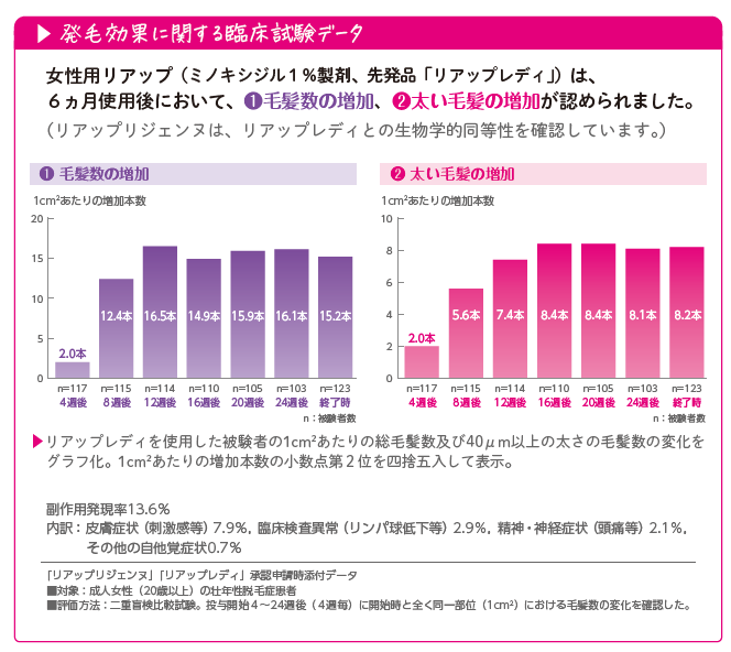 女性向け「リアップリジェンヌ」ミノキシジル1%配合の発毛エッセンスは、1日2回、6カ月の使用で発毛が認められた医薬品。大正製薬が行った、リアップリジェンヌ使用の発毛効果に関する臨床データを以下に紹介します。